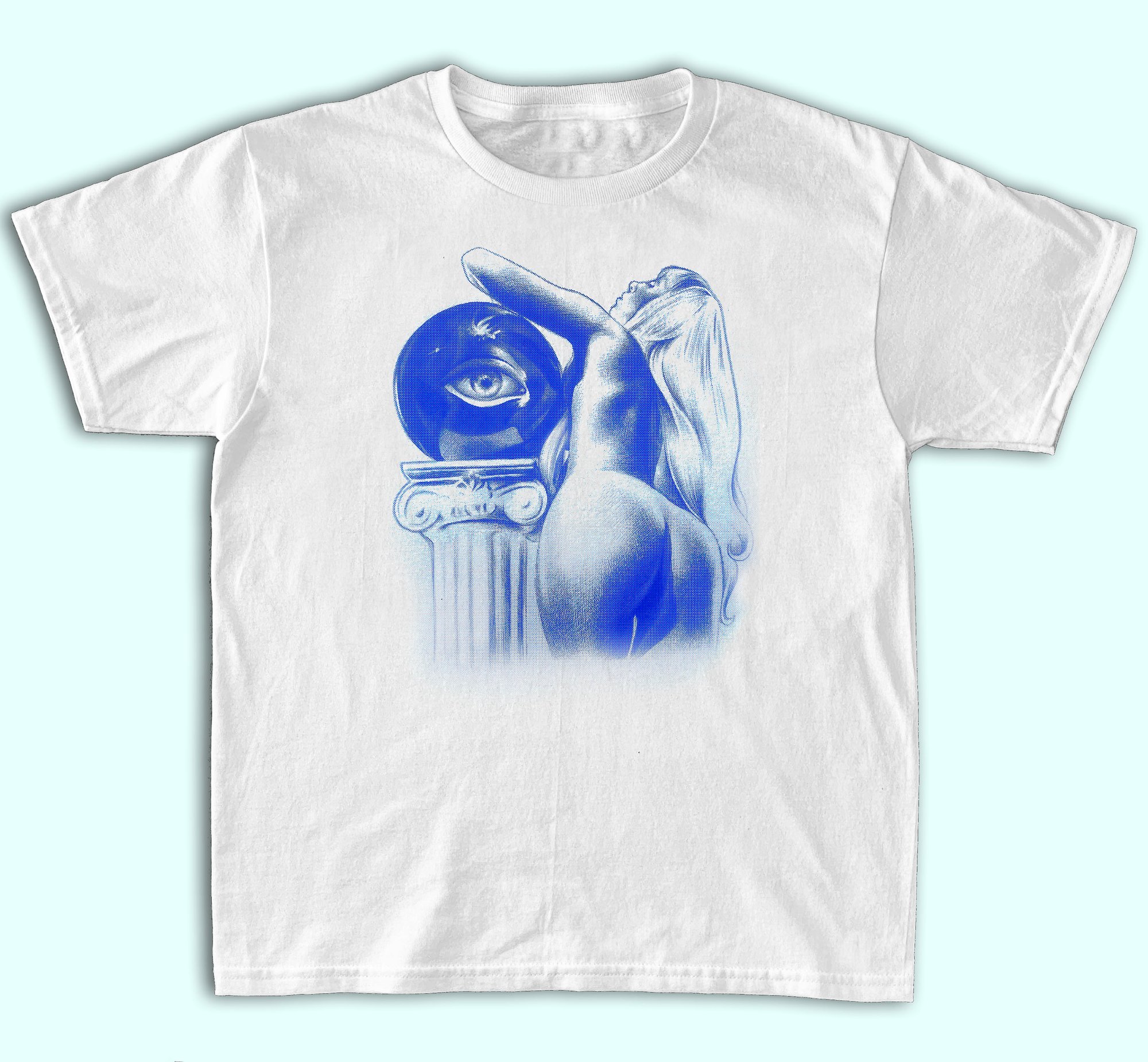 Handmade screen-printed white tee with blue speedball fabric ink